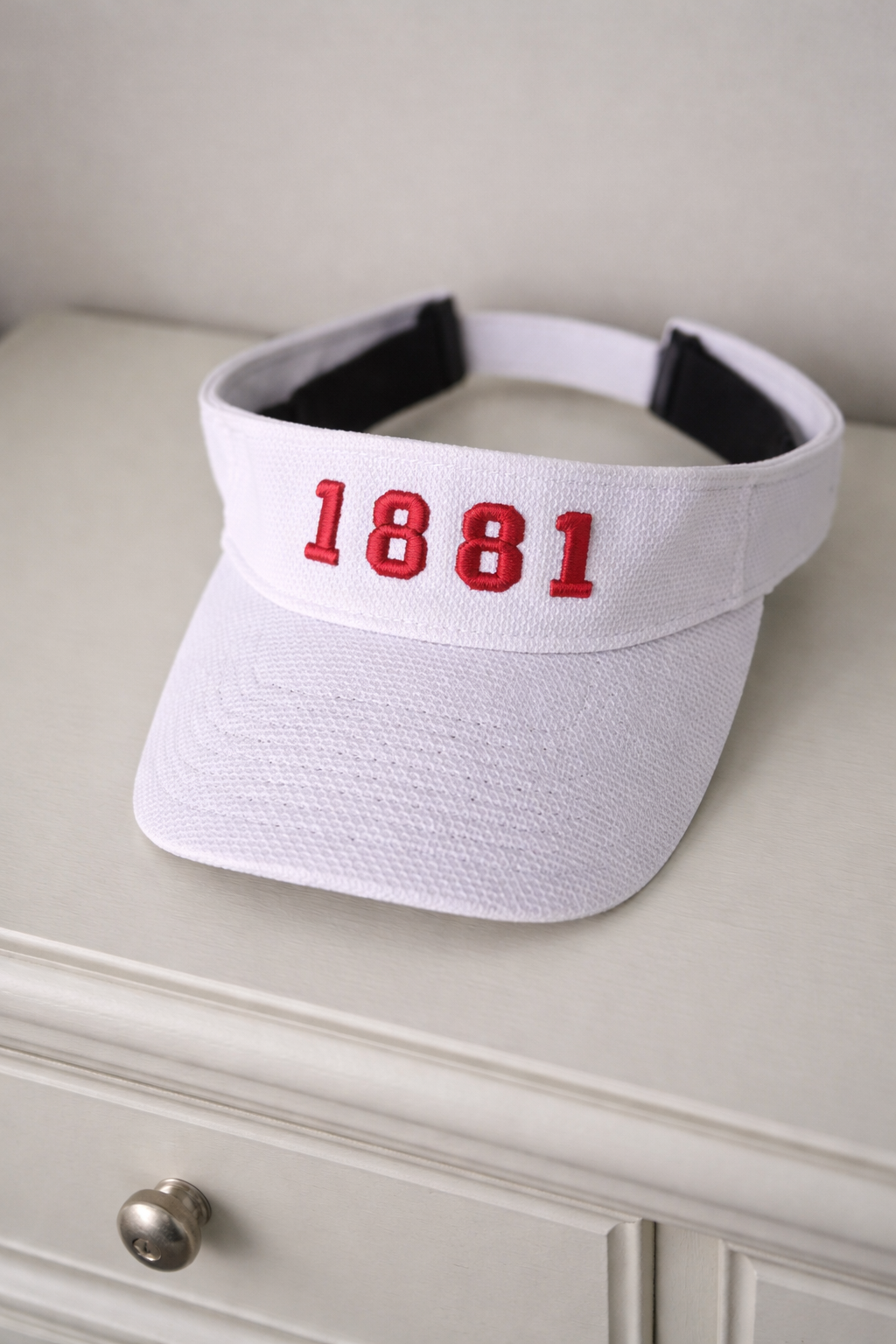 White golf visor embroidered with “1881,” honoring Tuskegee University’s founding year. Lightweight and easy-care.