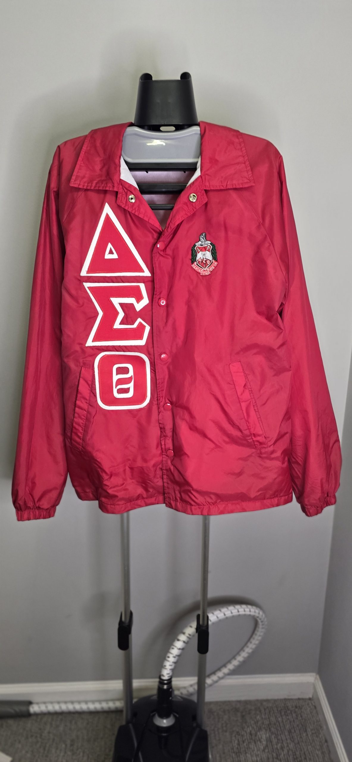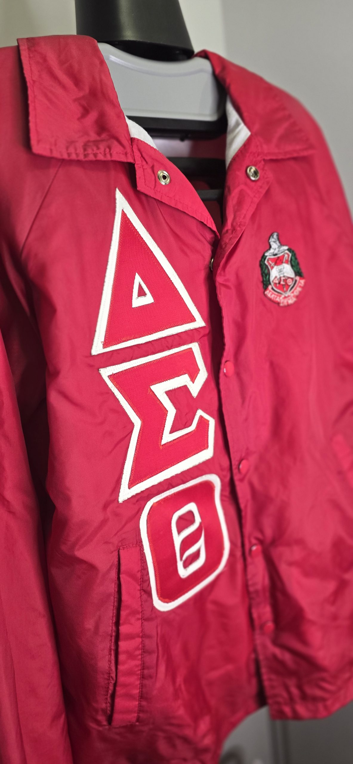 Crimson Delta Sigma Theta windbreaker featuring embroidered crest and bold Greek lettering. Heavier vintage quality; sleeves left blank for easy customization.