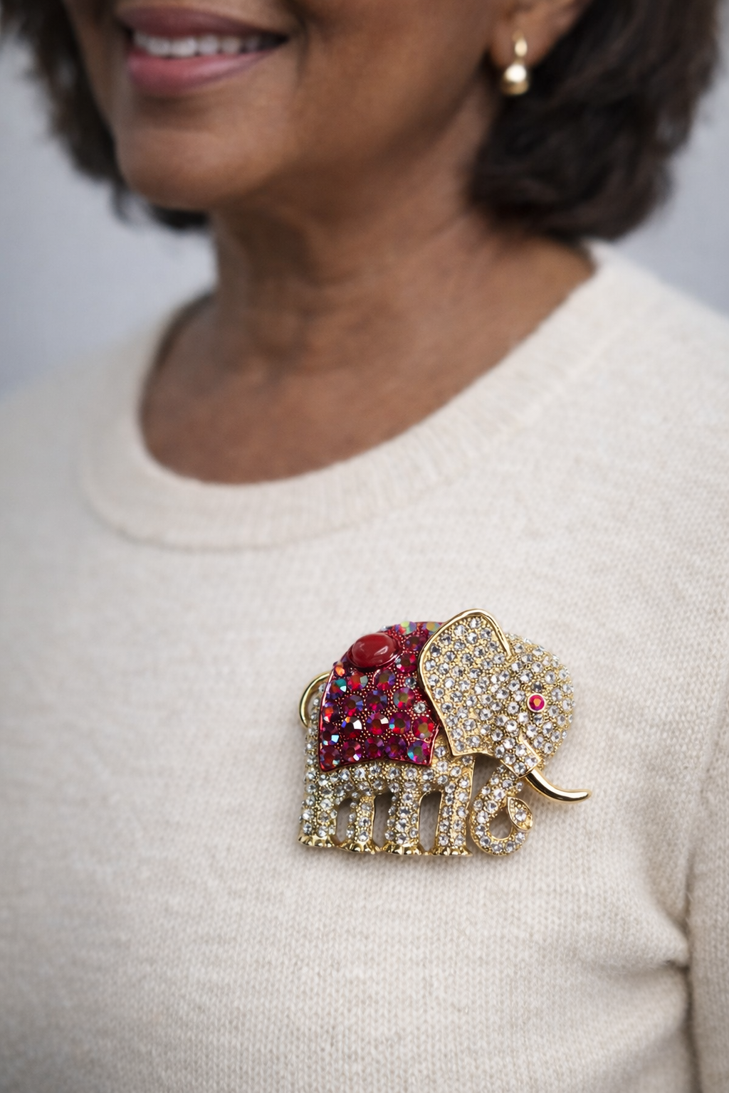 Gold-tone elephant brooch with rhinestones and crimson accents. Bold costume jewelry statement piece.